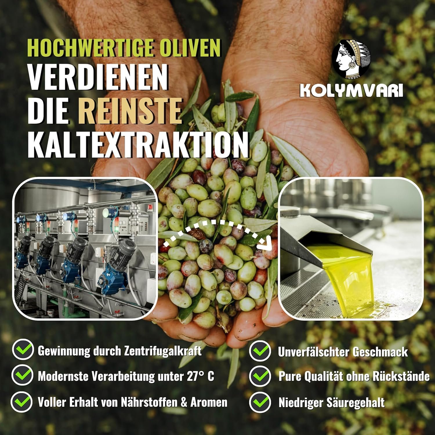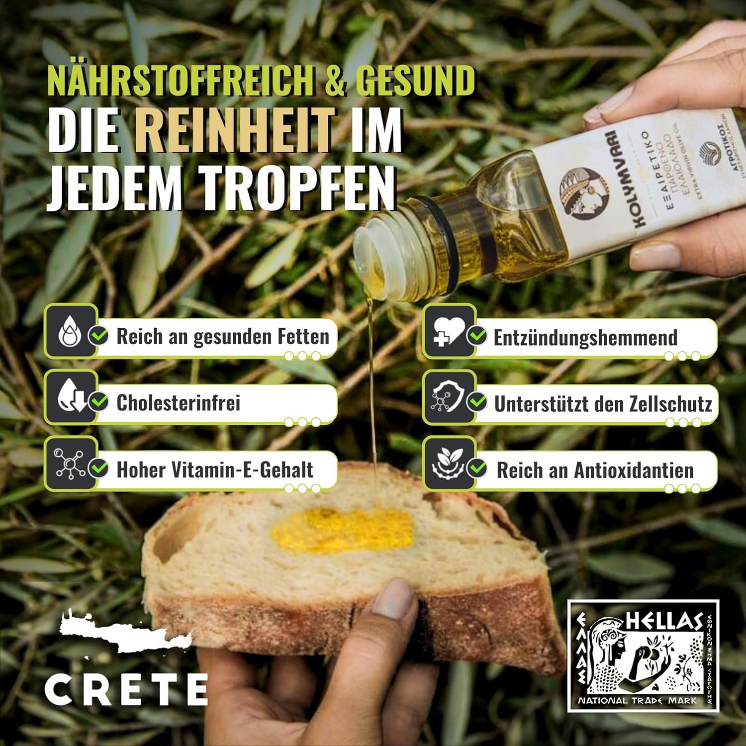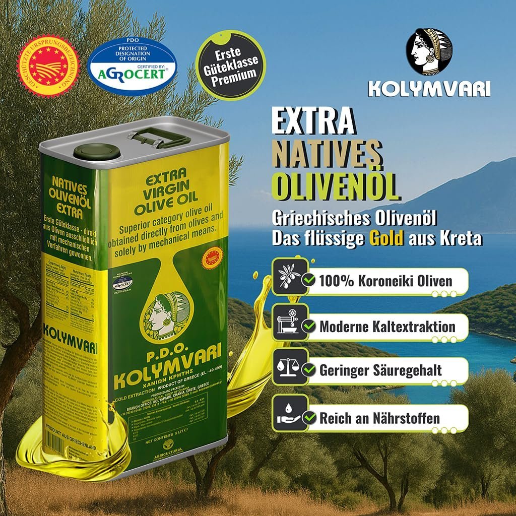 Erleben Sie das Aroma und die Qualität des Kolymvari Extra Nativ Olivenöls - aus Koroneiki Oliven Kretas mit geschützter Ursprungsbezeichnung (g.U.)